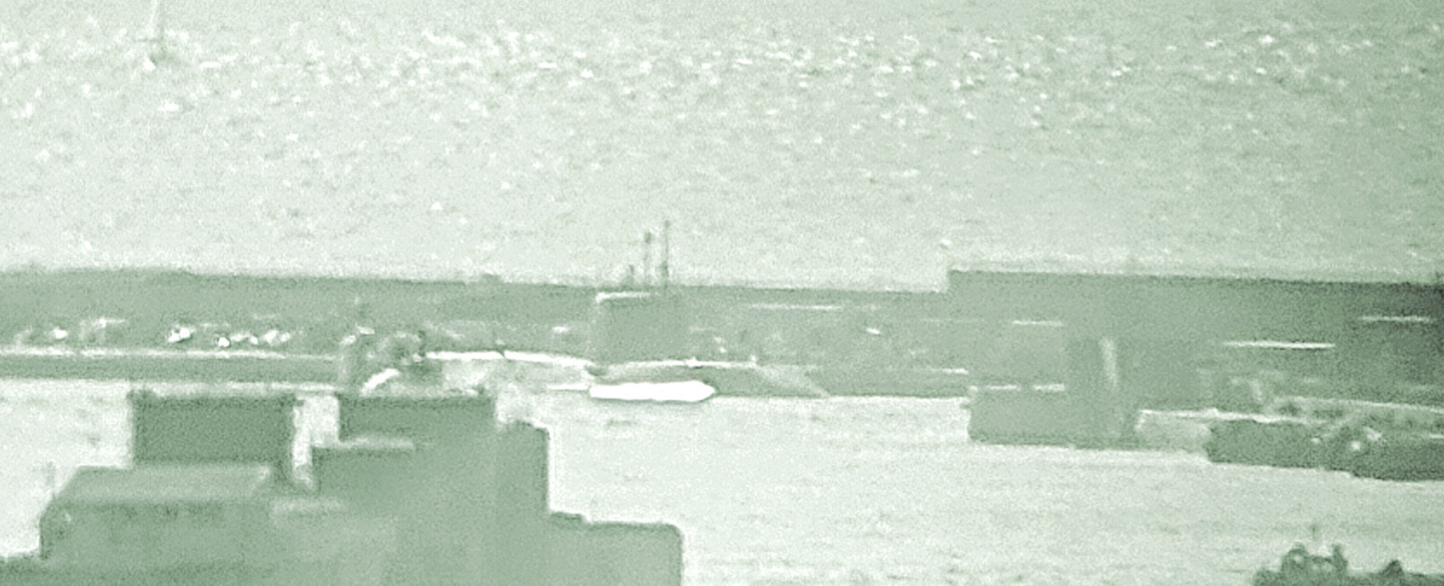 Foto. Atracado el submarino ayudado por remolcadores y una grúa se dispone a trabajar